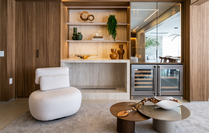 Mesmo sem a presença de paisagismo, o projeto se destaca pelo equilíbrio entre materiais, layout e iluminação, que juntos constroem uma atmosfera acolhedora e elegante.