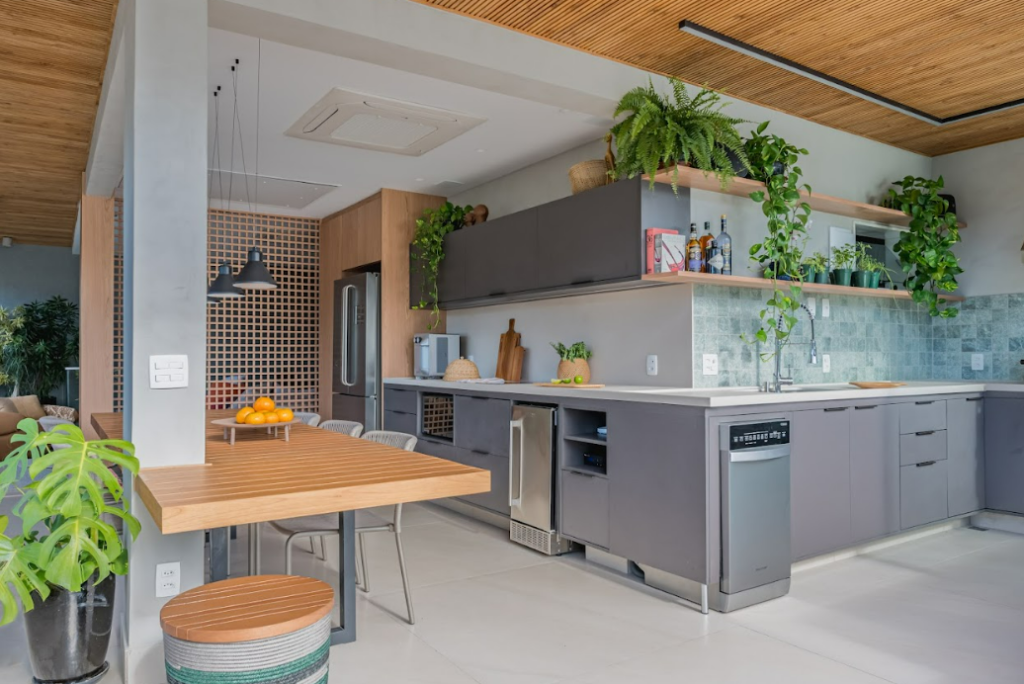 Um dos principais desafios do projeto era o excesso de calor na área gourmet. Para resolver essa questão, foram adotadas soluções técnicas que aliam conforto e versatilidade.