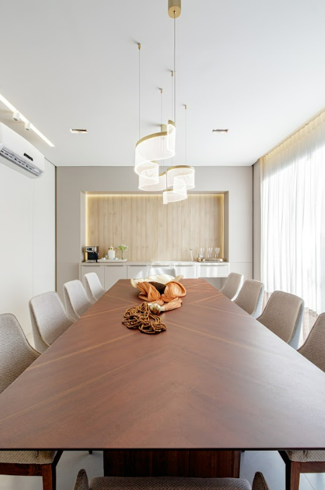 Na sala de jantar, tons neutros, madeira e o pendente sobre a mesa ressaltam a sofisticação do projeto