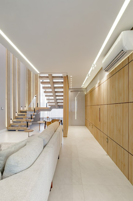 Detalhe da sala de estar, com painéis de madeira em tom claro, combinando com a escada de acesso ao piso superior