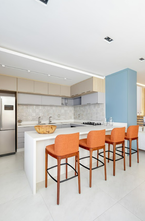 Para equilibrar essa neutralidade, há pontos de cor que trazem identidade e leveza à composição: as banquetas em terracota aquecem a cozinha, enquanto a estante azul no living acrescenta um toque de frescor e contemporaneidade. “O resultado é um projeto harmônico, que traduz de forma sensível o estilo de vida dos moradores”, finaliza Idelfonso.