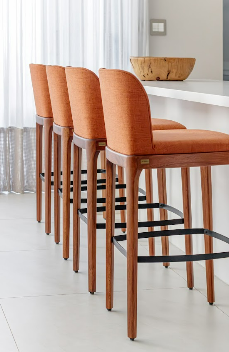 O tom alaranjado das banquetas destaca o design do mobiliário